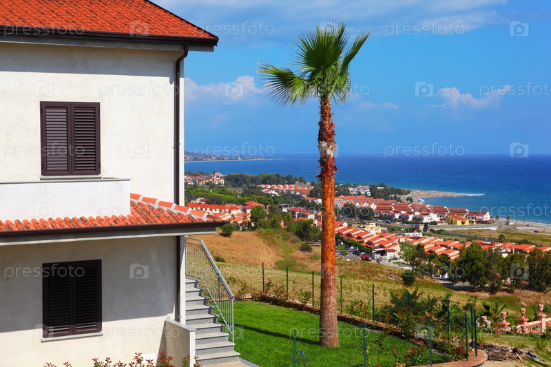 Большой белый двухэтажный дом с коричневой крышей, пальмами и лестницей