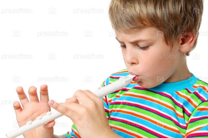 Юный мальчик играет на белой флейте с акцентом