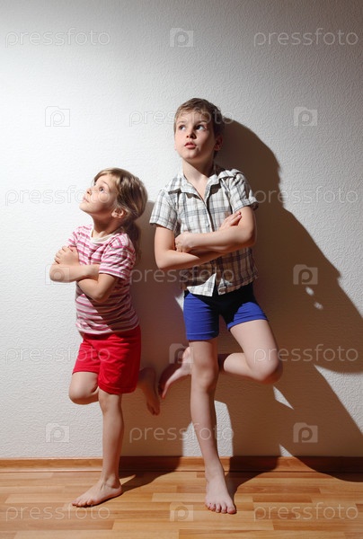 Вдумчивый мальчик и девочка в домашней одежде стоят со сложенными руками и