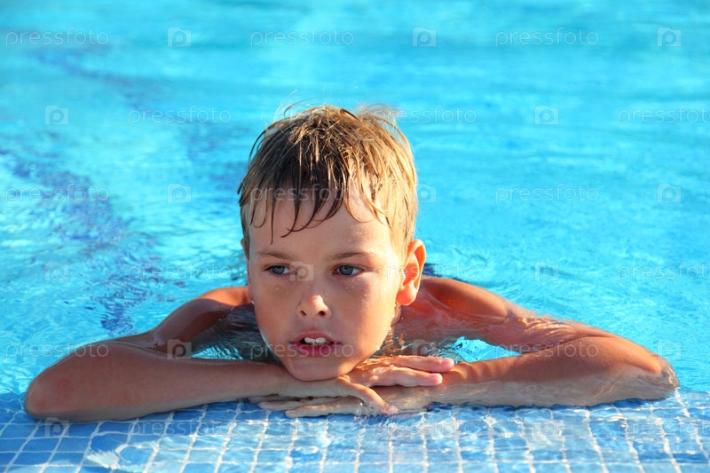 Молодой мальчик отдыхает у бассейна, вокруг него вода