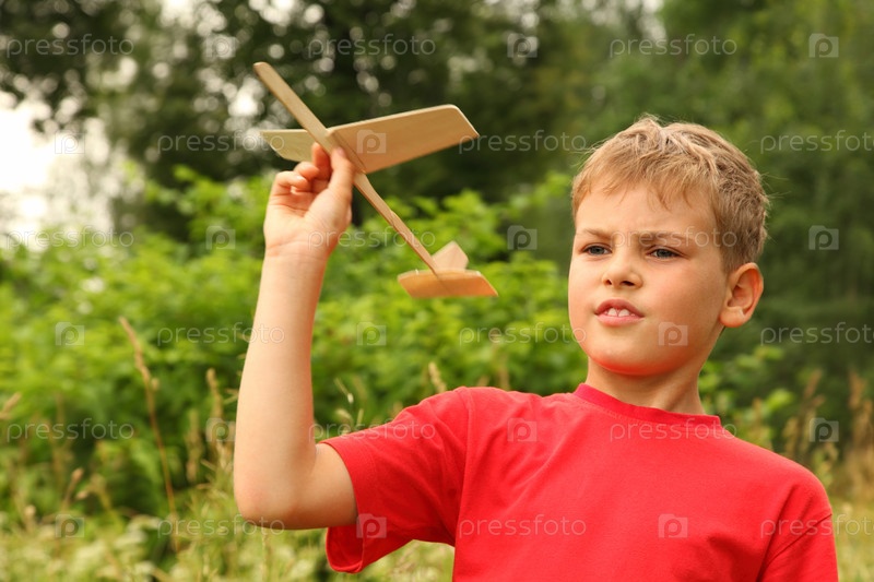 Маленький мальчик держит картонный самолет на открытом воздухе