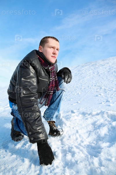 Человек сконцентрированно смотрит зимой на приседание в небе и опирается на руку