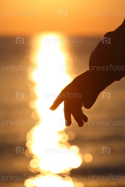 Силуэт руки, простирающейся к светящейся воде на закате