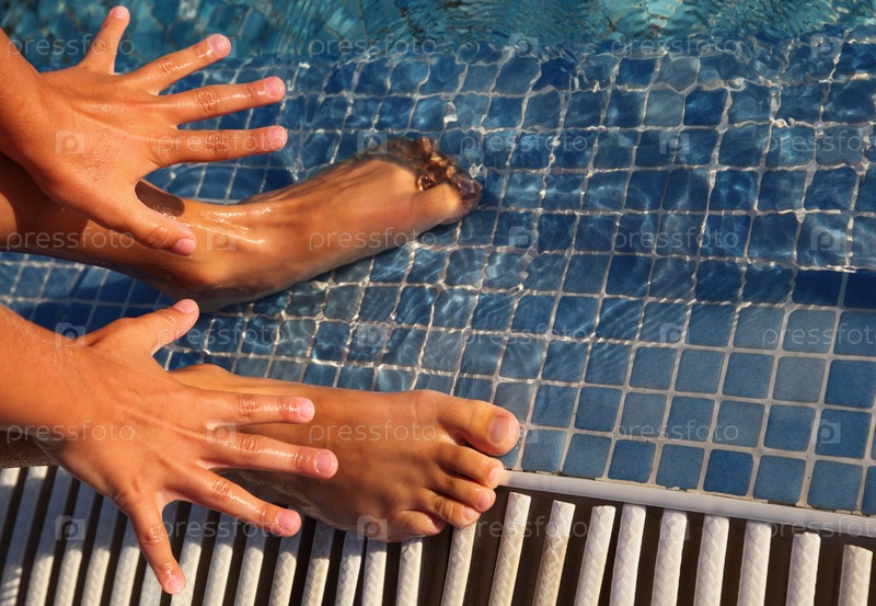 Руки касаются воды рядом с краем бассейна