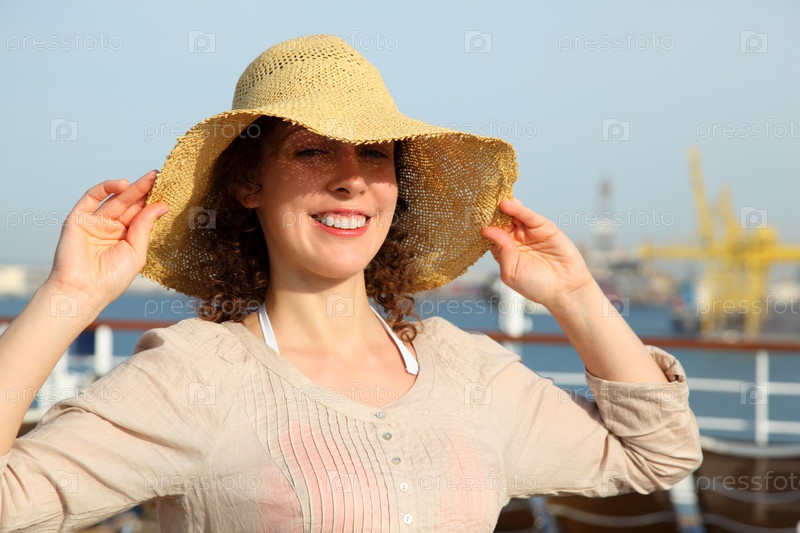 Женщина улыбается, настраивая широкую соломенную шляпу в солнечный день