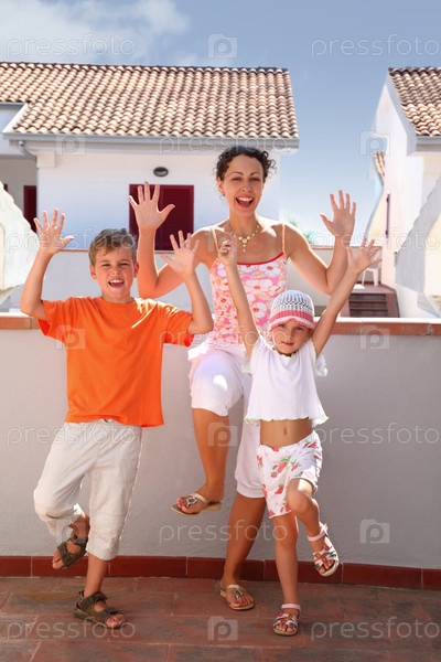 Мать с мальчиком и девочкой стоит на балконе одной ногой и поднимает руки