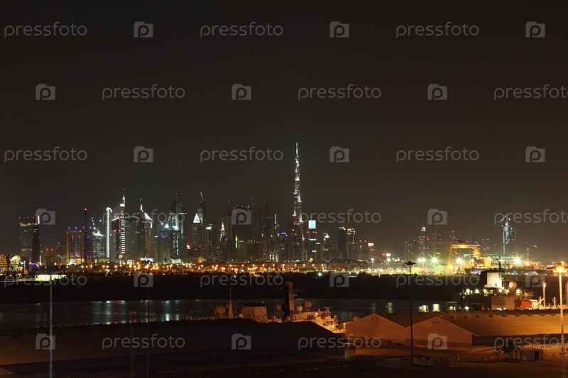 Городской пейзаж Дубая с небоскребами и другими зданиями, огнями ночи