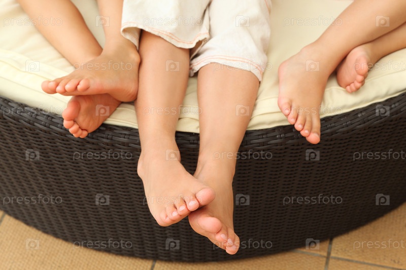 Три босые ноги отдыхают на темном плетеновом краю