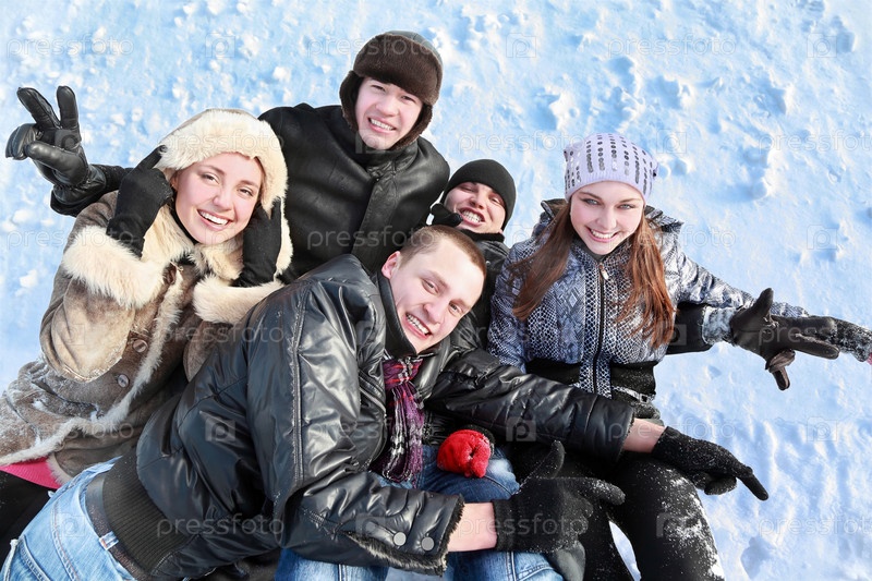 Пять человек счастливо позируют в снежной обстановке на открытом воздухе