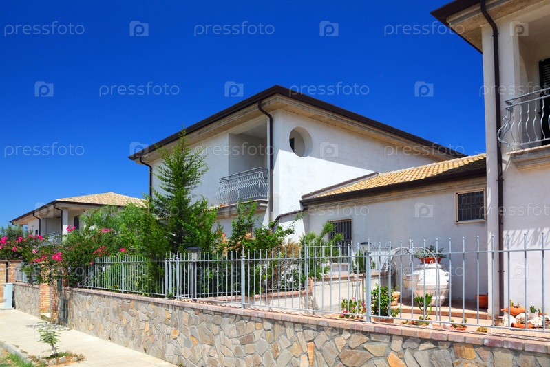 Ограждение белых двухэтажных коттеджей с садом и балконом на солнце