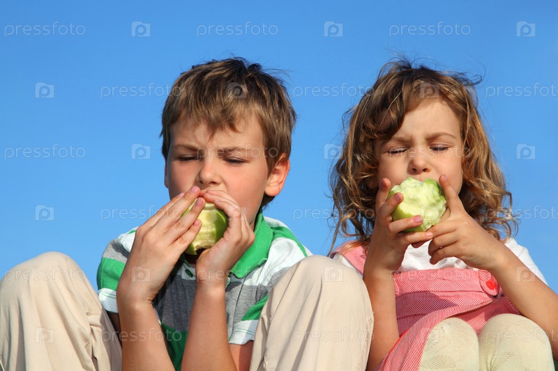 Два красивых ребенка, на фоне голубого неба едят большой зеленый