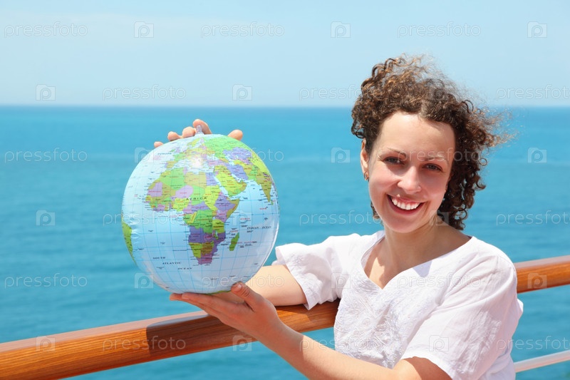 Женщина улыбается, держа земной шар на палубе круизного лайнера