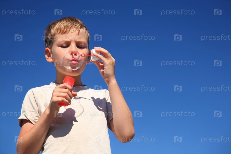 Молодой мальчик вдыхает пузырь против чистого голубого неба