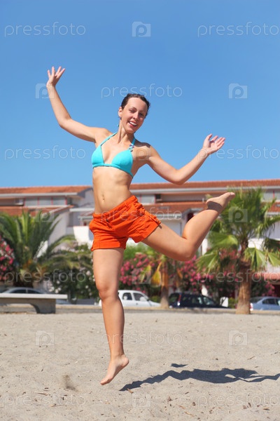 Молодая женщина радостно прыгает на песчаном пляже
