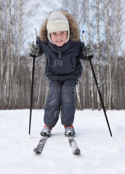Молодой мальчик стоит на лыжах для бега и опирается на столбы внутри