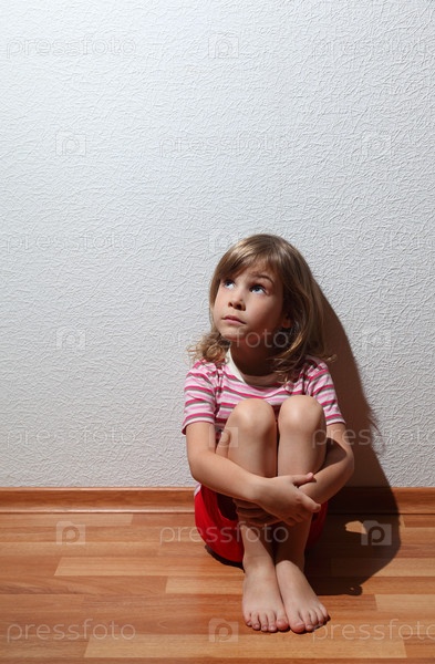 Маленькая девочка в повседневной одежде выглядит грустно за углом, откуда приходит