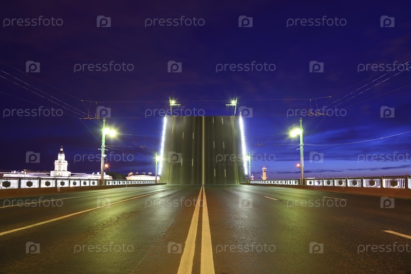 Ночной вид поднятого моста в Санкт-Петербурге, Россия