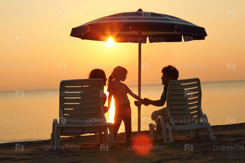 Мама с отцом сидят на пляже вечером под зонтиком и обнимаются