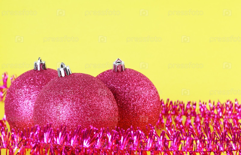 Верхняя часть трех красных шаров на рождественской елке, окруженные фиолетовым брезентом