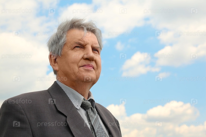 Седой мужчина в костюме смотрит вверх