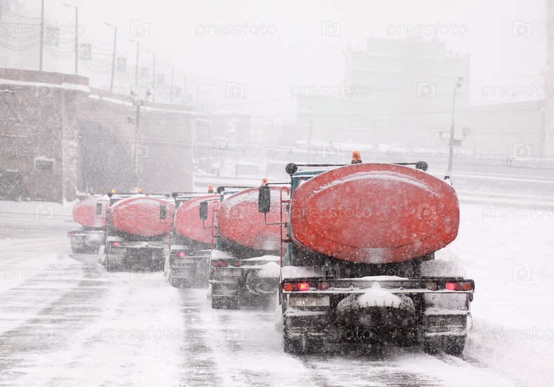 Колонна из пяти грузовиков-снегоочистителей на дороге в Москве, Россия