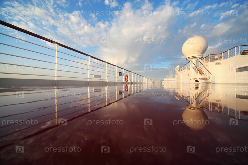 Палуба круизного лайнера отражается в спокойной, зеркальной воде