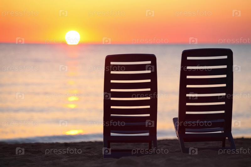 Два пустых темно-синих стула стоят на пляже вечером с видом на