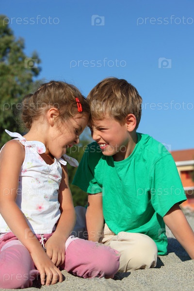 Два ребенка сидят рядом на песке, улыбаясь друг другу