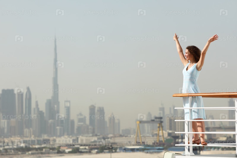 Молодая красота брюнетка женщина стоит на палубе круизного лайнера, ставит