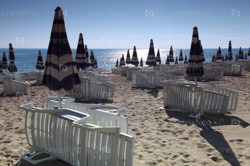 Шизлонги аккуратно построены рядом с закрытыми пляжными зонтиками утром