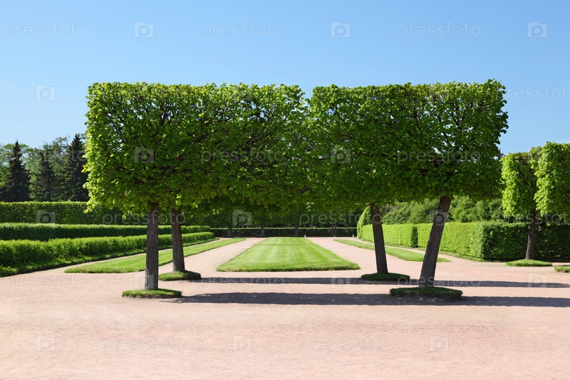 Симметричные деревья хребта выстраивают гравийный путь в солнечном саду