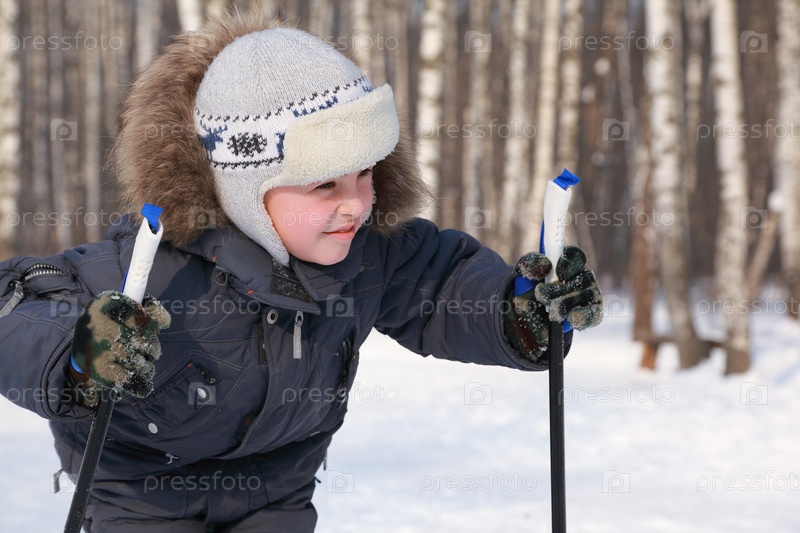 Портрет молодого мальчика с лыжными палками, глядящего на сторону внутри зимы
