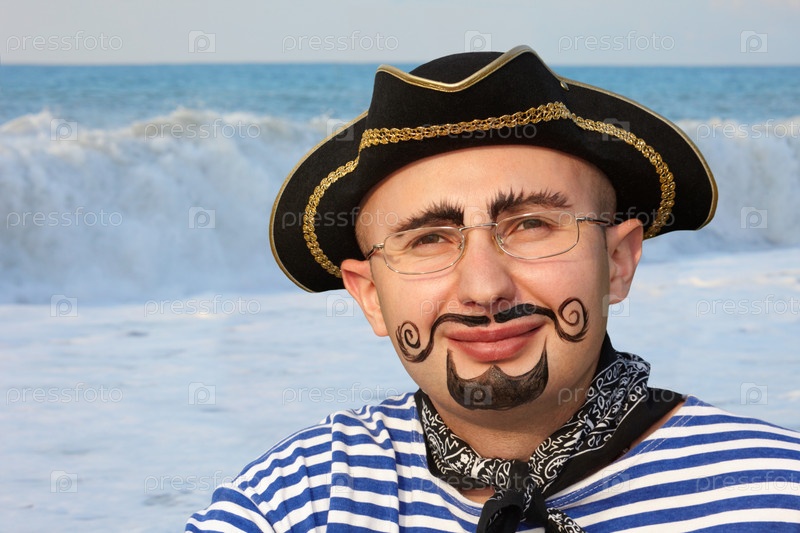 Портрет улыбающегося человека с вытянутой бородой и усами в пиратском костюме