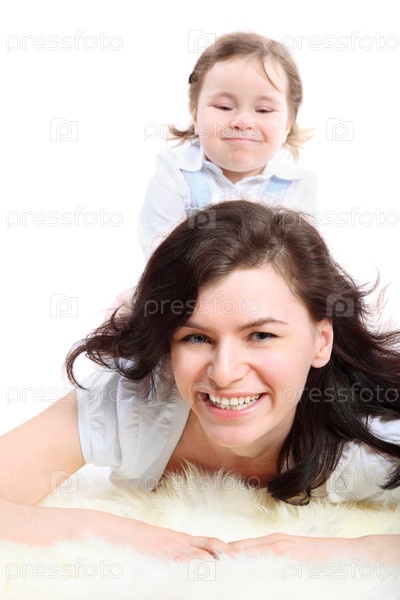 Забавная девочка сидит на маме, которая лежит на белом пушистом ковре
