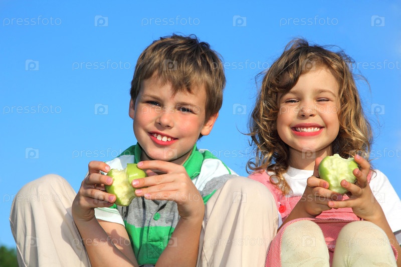 Два ребенка улыбаются, когда едят яблоки на свежем воздухе