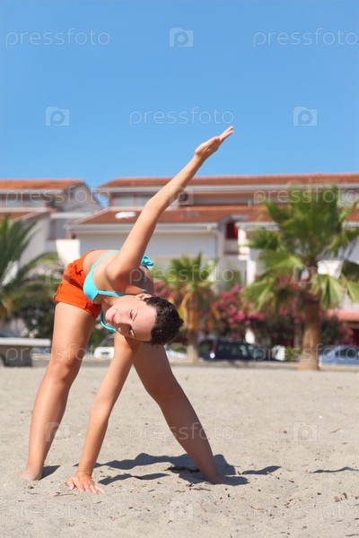 Молодая женщина растягивается на пляже под чистым голубым небом