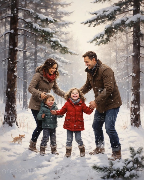 Счастливая семья гуляет в зимнем лесу среди падающего снега