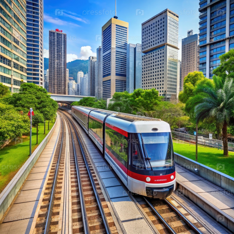 Легкостроительный поезд, путешествующий по городскому ландшафту Гонконга в солнечный день