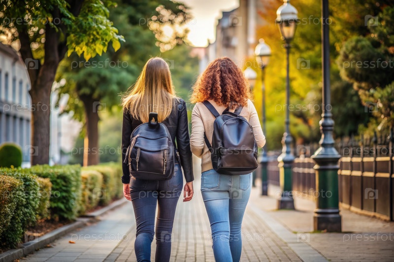Две молодые женщины, идущие по городской тротуару