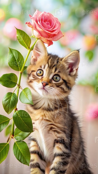 Игровой котенок Табби, любопытно глядящий на яркую розовую розу в цветочном саду