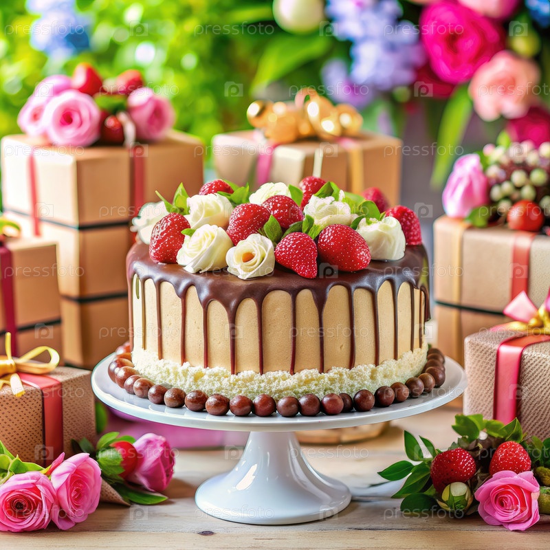 Вкусный шоколадный торт со клубникой и белыми розами, окруженные подарками