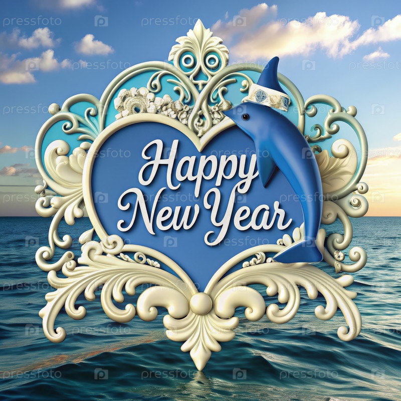 Элегантный дельфинский орнамент с приветствием на Новый год в синем сердце