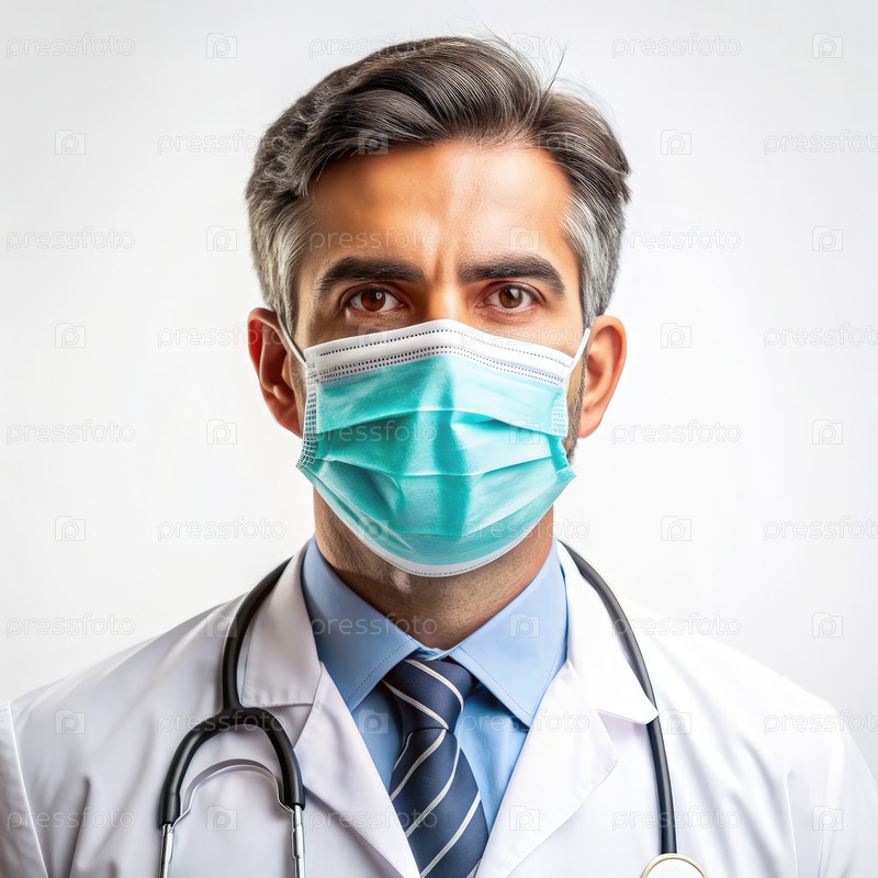 Преданный врач носит маску на белом фоне, подчеркивая здоровье и безопасность во время ухода за пациентом