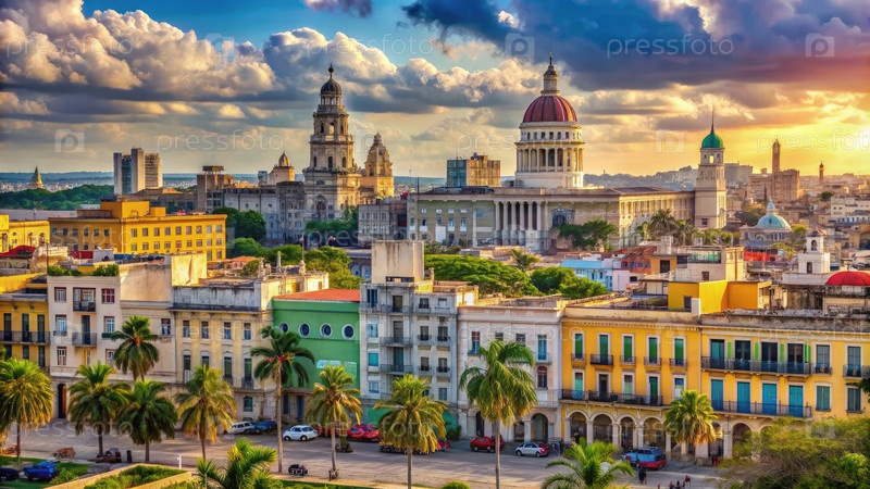 Яркий закат солнца над историческим городским пейзажем Гаваны с классической архитектурой и пальмами
