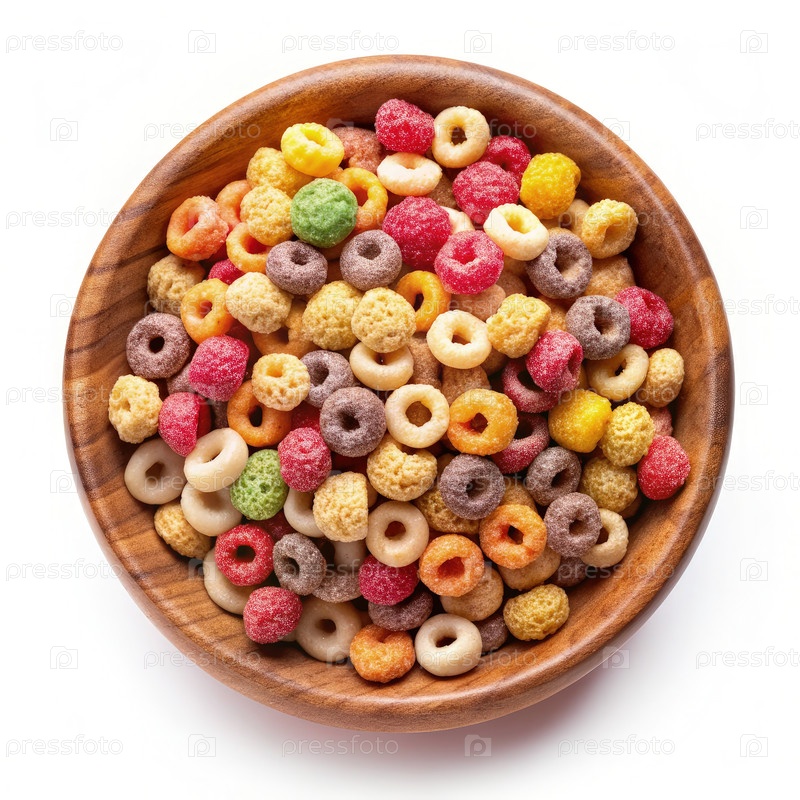 Красочные кольца хлопьев в деревянной чашке на белом фоне