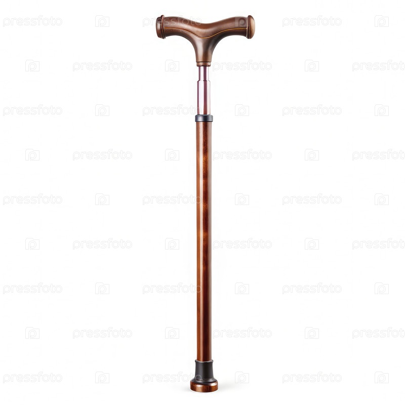 Коричневая деревянная трость для ходьбы с рукояткой в форме T на белом фоне