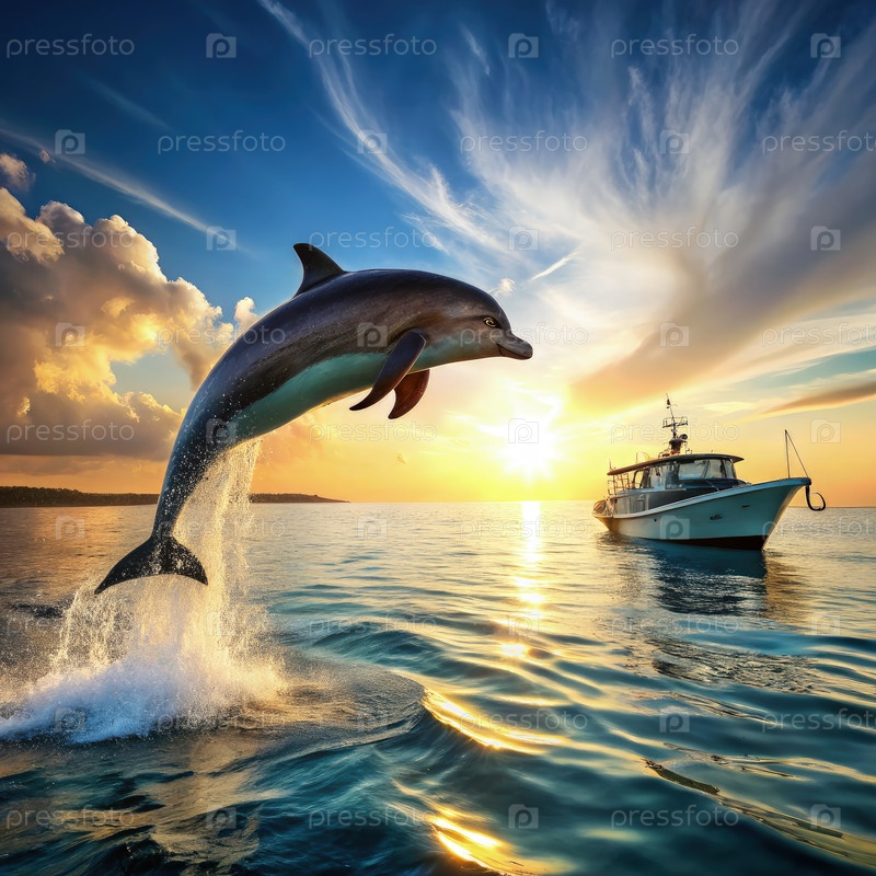 Дельфин прыгает из воды на закате