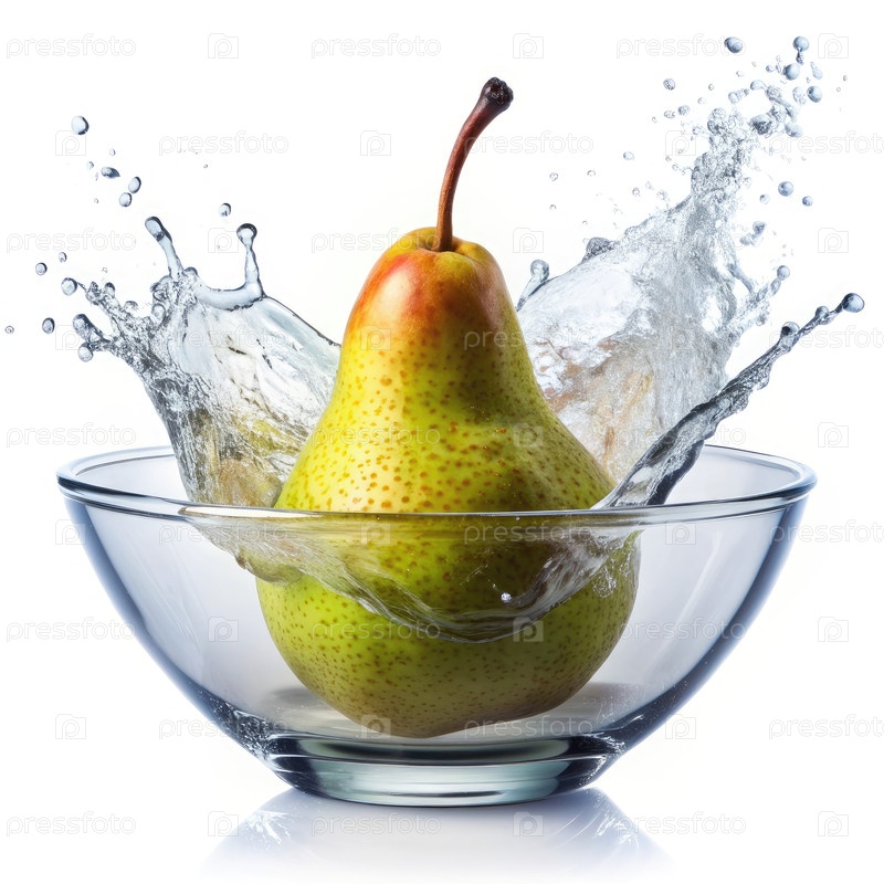 Одинокая зеленая груша брызгает в стеклянную миску с водой