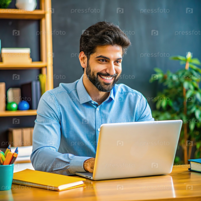 Веселый профессионал, работающий на ноутбуке за рабочим столом Окруженный зеленью в дневное время