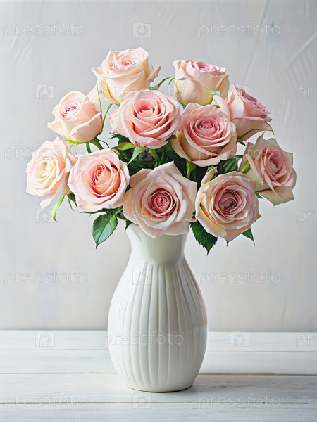 Белая ваза, наполненная бледно-розовыми розами на белом столе